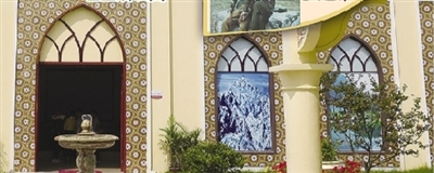 巴基斯坦園是一座布局對稱的波斯庭院:兩座身著彩繪外衣的前亭,十字交叉的小路,四塊蔥郁青翠的草坪,米黃色的主體建筑正中是對開的木質(zhì)大門,金色的馬賽克外墻上嵌有六扇對稱的尖拱方窗……令人瞬間墜入神秘的西域。