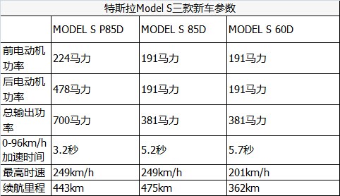 ????而Model S 60D以及Model S 85D可以看作是入門級(jí)和中配車型,前者的電池容量為60kWh,而后者則為80kWh,兩款車型也將使用雙電動(dòng)機(jī)四驅(qū)系統(tǒng),總輸出功率均為381馬力,Model S 60D以及Model S 85D的0-96km/h加速時(shí)間分別為5.7秒和5.2秒,續(xù)航里程為362km和475km。