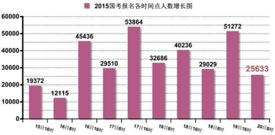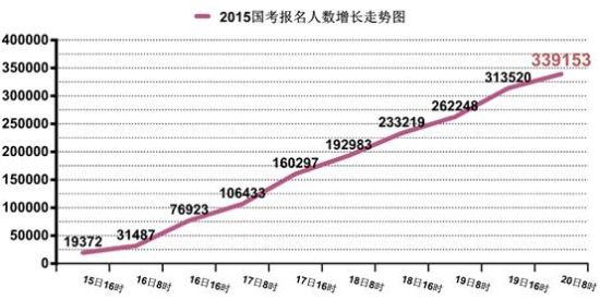 10月20日,2015國考報名進入第6天。截至上午8點,報名審核人數(shù)已達339153人,同昨天16時數(shù)據(jù)相比,增長了25633人。與去年同期的432331人和前年同期的447129人相比,差距近10萬。平均競爭比為15:2:1,不及去年同期的22:1及前年同期的21:1。仍有1094個職位無考生通過審核,占總職位數(shù)的8.1%。