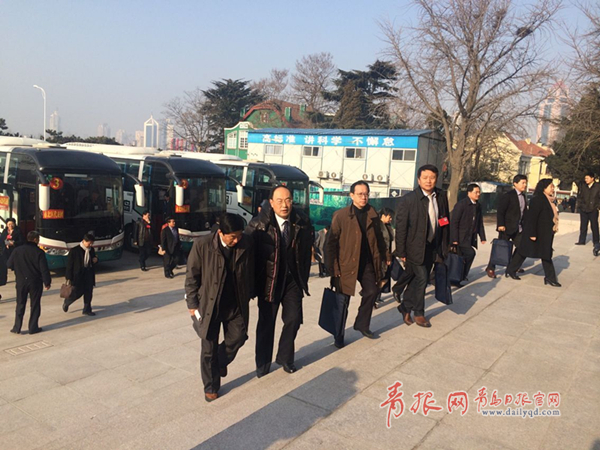 ??? 青島日?qǐng)?bào)/青報(bào)網(wǎng)訊 作為全市人民政治生活的大事和社會(huì)各屆高度關(guān)注的盛會(huì),青島市第十五屆人民代表大會(huì)第四次會(huì)議將于今日(2月13日)上午九點(diǎn)半在市人民會(huì)堂舉行。集體乘坐會(huì)議車輛的代表們來(lái)到市人民會(huì)堂,陸續(xù)進(jìn)入會(huì)議現(xiàn)場(chǎng)。