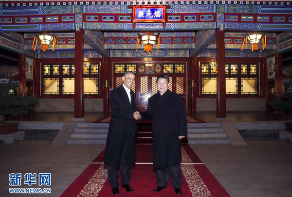 習近平與奧巴馬拾階而上,來到涵元殿舉行會晤,就中美關系及共同關心的重大國際和地區(qū)問題深入交換意見。