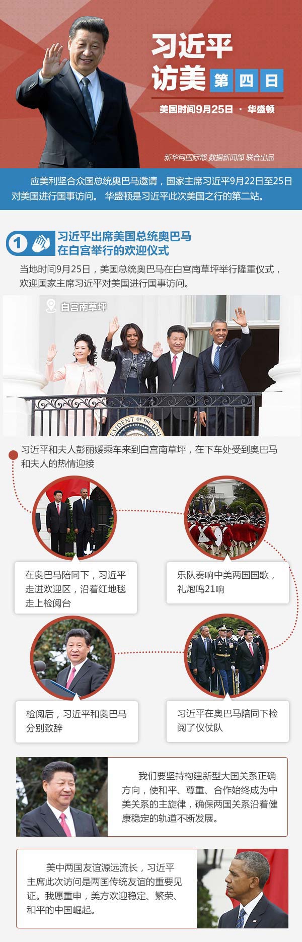 美國總統(tǒng)奧巴馬在白宮南草坪舉行隆重儀式,歡迎國家主席習(xí)近平對(duì)美國進(jìn)行國事訪問。習(xí)近平和夫人彭麗媛在下車處受到奧巴馬和夫人的熱情迎接。