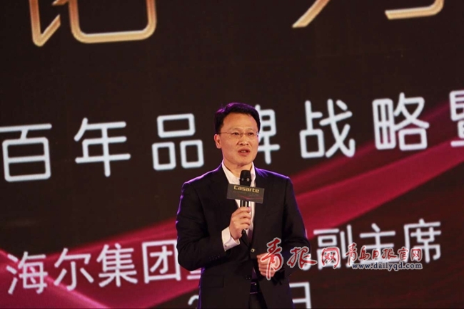 海爾集團(tuán)董事局副主席、輪值總裁梁海山在發(fā)布會(huì)上講話 青島日?qǐng)?bào)/青報(bào)網(wǎng)記者 張麗潔攝