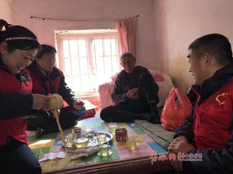 ?? 第一家探望的是88歲的曲方平,一進門,老人正坐在炕上等著志愿者們的到來。因為曲方平的肺部一直不好,志愿者為他買來了梨和蘋果,叮囑老人家多吃梨可以潤肺,并為老人親手削梨。曲方平邊吃邊說:“這梨好吃。真甜!”