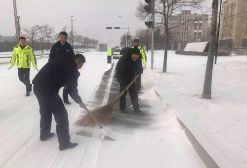 戰(zhàn)斗在除雪第一線的當然還有我們高新區(qū)的交警,掃雪、推車,加強警力部署,路面巡邏,保證行人安全,道路暢通。