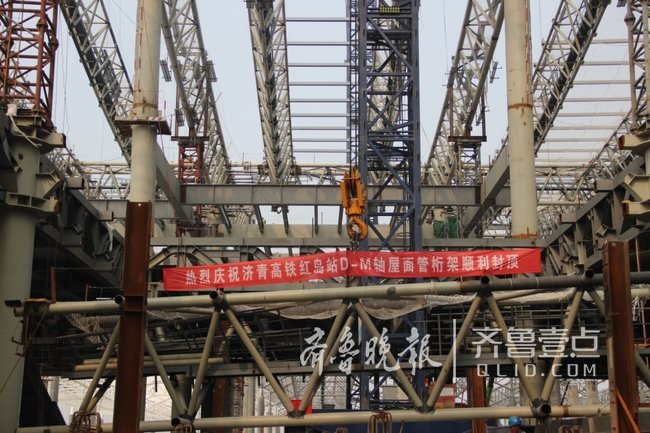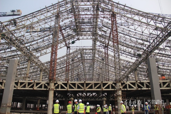 4月30日上午,陽光正好,微風(fēng)不燥,濟(jì)青高鐵紅島站項目鋼結(jié)構(gòu)施工現(xiàn)場橫幅高掛、鞭炮齊鳴。8點58分,伴隨著D-M軸最后一榀管桁架緩緩起吊,紅島站鋼結(jié)構(gòu)工程D-M軸成功封頂,標(biāo)志著項目順利完成階段性建設(shè)任務(wù)。中建八局鋼結(jié)構(gòu)工程公司黨委書記、董事長、總經(jīng)理梁建軍、生產(chǎn)副經(jīng)理秦賓、總工程師兼紅島項目總指揮馮國軍、助理總經(jīng)理付用團(tuán)、顧問總工朱雪亮、料具管理中心經(jīng)理張百濤及副經(jīng)理張福勝、濟(jì)南經(jīng)理部經(jīng)理兼紅島站項目經(jīng)理石峰及紅島站項目全體人員參加了此次活動。