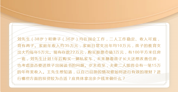 ????? 配置保險,轉移風險,減少損失。不管是社保的五險一金,還是自行購買的商業(yè)保險,其本質都是為了給我們的生活提供保障,防范未知的風險,在疾病和意外到來之時不用擔心給家庭和生活造成巨大的經濟負擔。尤其是劉先生家育有二子,未來還有出國留學的計劃,所以更要提前做好保險儲備。