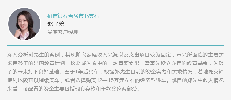 ????? 配置固定收益類產品,賺取穩(wěn)定收益。固收產品的收益相對活期更高,而風險又比浮動收益產品更低,適合用來賺取穩(wěn)定收益,比如劉先生想要一年后換一輛車,就可以配置一年期限的固收產品。建議配置占到總資產的40%左右,劉先生可以拿出15萬元購買相應的產品,比如結構性存款,凈值型理財等。