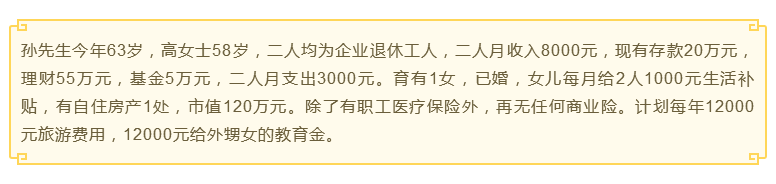 ????? 老年人最主要的是健康與安全,雖然孫先生夫妻倆都有養(yǎng)老保險(xiǎn)和醫(yī)療保險(xiǎn),為預(yù)防其他意外情況發(fā)生,建議孫先生購買家庭意外險(xiǎn)和醫(yī)療險(xiǎn)。因?yàn)閷O先生家庭年齡偏大,重疾的杠桿作用不大。所以建議孫先生家庭購買消費(fèi)型的意外險(xiǎn)和醫(yī)療險(xiǎn)。這種保險(xiǎn)是報(bào)銷型的,是社保的必要補(bǔ)充,可以把自費(fèi)支出控制在一定范圍內(nèi),合理的減輕了醫(yī)療費(fèi)用支出。小投入,大杠桿。年支出5000元左右。