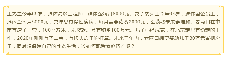 ????? 王先生及秦女士處于退休期,家庭形態(tài)以夫妻兩人為主,處于家庭生命周期的衰老期,資產(chǎn)規(guī)劃以保守防御為主要原則,目標(biāo)是保障有充裕的資金安度晚年的生活。王先生夫妻退休收入穩(wěn)定,整個家庭的唯一收入來源就是退休金。未來要給孩子贊助買房子以及兩人的預(yù)期醫(yī)療費(fèi)用不斷增加,選擇適合自己風(fēng)險(xiǎn)偏好的理財(cái)項(xiàng)目,增厚理財(cái)收益,提高家庭資產(chǎn)防御風(fēng)險(xiǎn)的能力。讓手頭的錢“賺”錢,“人退休,錢永不退休”!