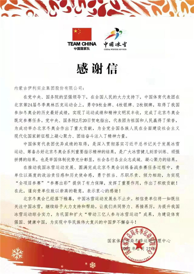 憑借在北京冬奧會上的突出表現(xiàn),伊利收獲了國家體育總局的“點(diǎn)贊”。國家體育總局冬季運(yùn)動管理中心的特別感謝信里明確指出,在推動我國冰雪運(yùn)動發(fā)展、圓滿完成北京冬奧會訓(xùn)練備戰(zhàn)參賽任務(wù)過程中,伊利勇于擔(dān)當(dāng)、盡職盡責(zé)、傾力相助,提供了有力保障,發(fā)揮了重要作用,作出了積極貢獻(xiàn)!
