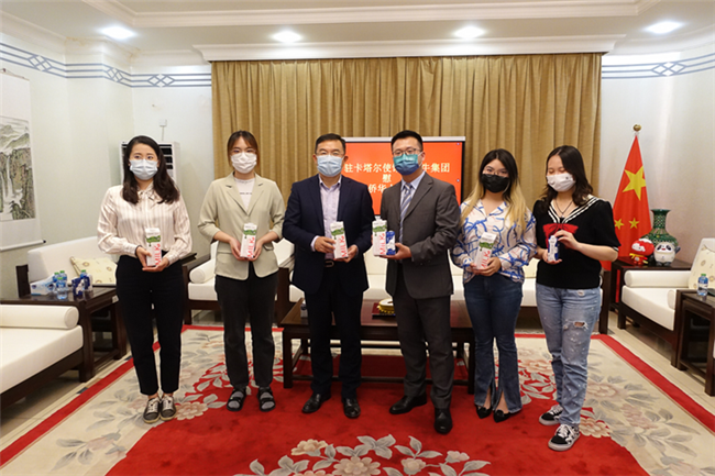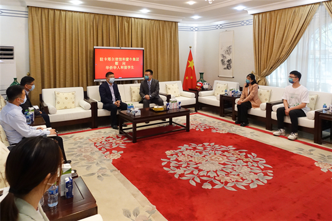 ?????? 近期,中國駐卡塔爾使館攜手蒙牛集團(tuán)舉辦慰問在卡華僑華人和留學(xué)生活動(dòng)。周劍大使和蒙牛集團(tuán)體育營銷總經(jīng)理孫軍在使館親切會(huì)見在卡華僑華人和留學(xué)生代表,并向大家贈(zèng)送了由防疫物資和蒙牛乳制品組成的“健康包”。