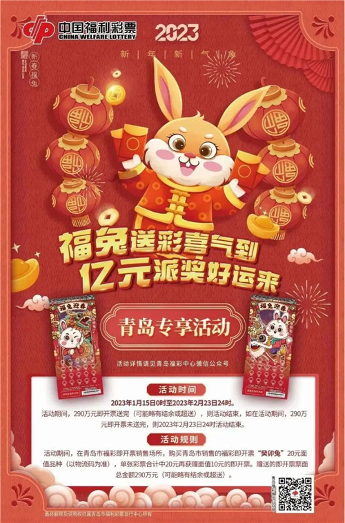 ?????? 2023年1月15日0時至2023年2月23日24時,在青島市福彩即開票銷售場所,購買青島市銷售的福彩即開票“癸卯兔”20元面值品種(以物流碼為準),單張彩票合計中20元再獲贈面值10元的即開票。贈送的即開票票面總金額290萬元(可能略有結余或超送)。活動期間,290萬元即開票送完,則活動結束;若290萬元即開票未送完,則2023年2月23日24時活動結束。