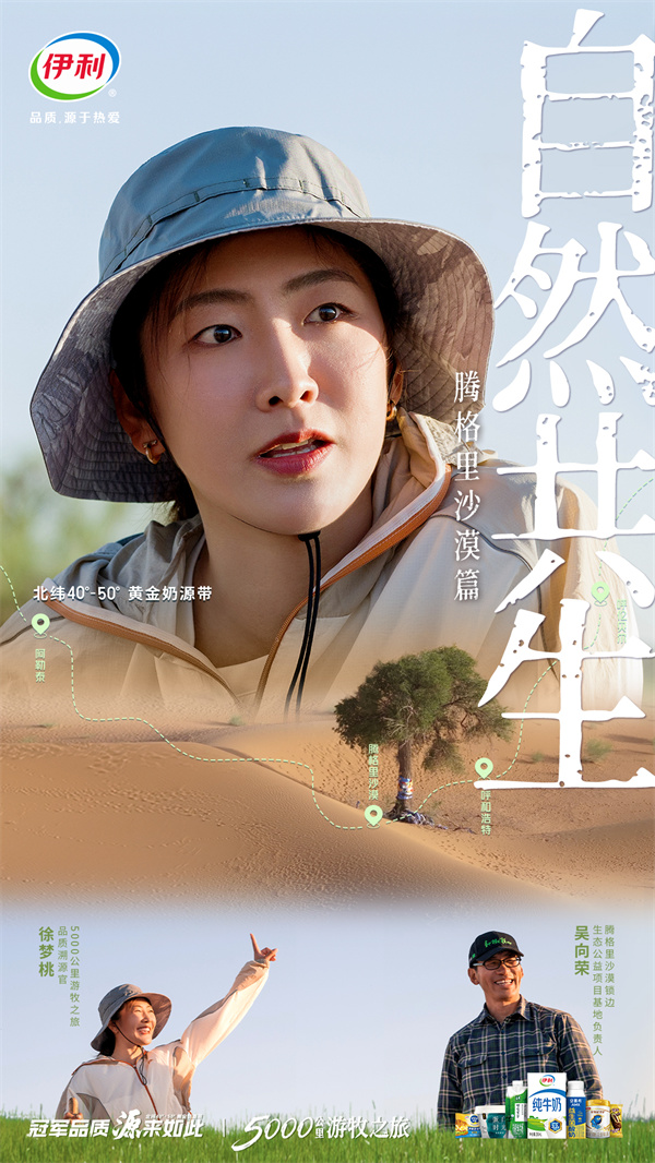 ?????? 行走于沙漠中,徐夢(mèng)桃和騰格里沙漠鎖邊生態(tài)公益項(xiàng)目基地負(fù)責(zé)人吳向榮探討逆境翻盤的故事,一起種樹植心和伊利共同守護(hù)綠色家園。