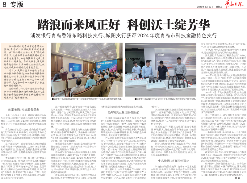 ????? ?截至2025年6月末,浦發(fā)銀行青島分行服務(wù)科技企業(yè)已超6000家,提供信貸支持超270億元,覆蓋轄區(qū)內(nèi)70%以上的“專精特新”“小巨人”企業(yè)和全部科創(chuàng)板上市企業(yè)。