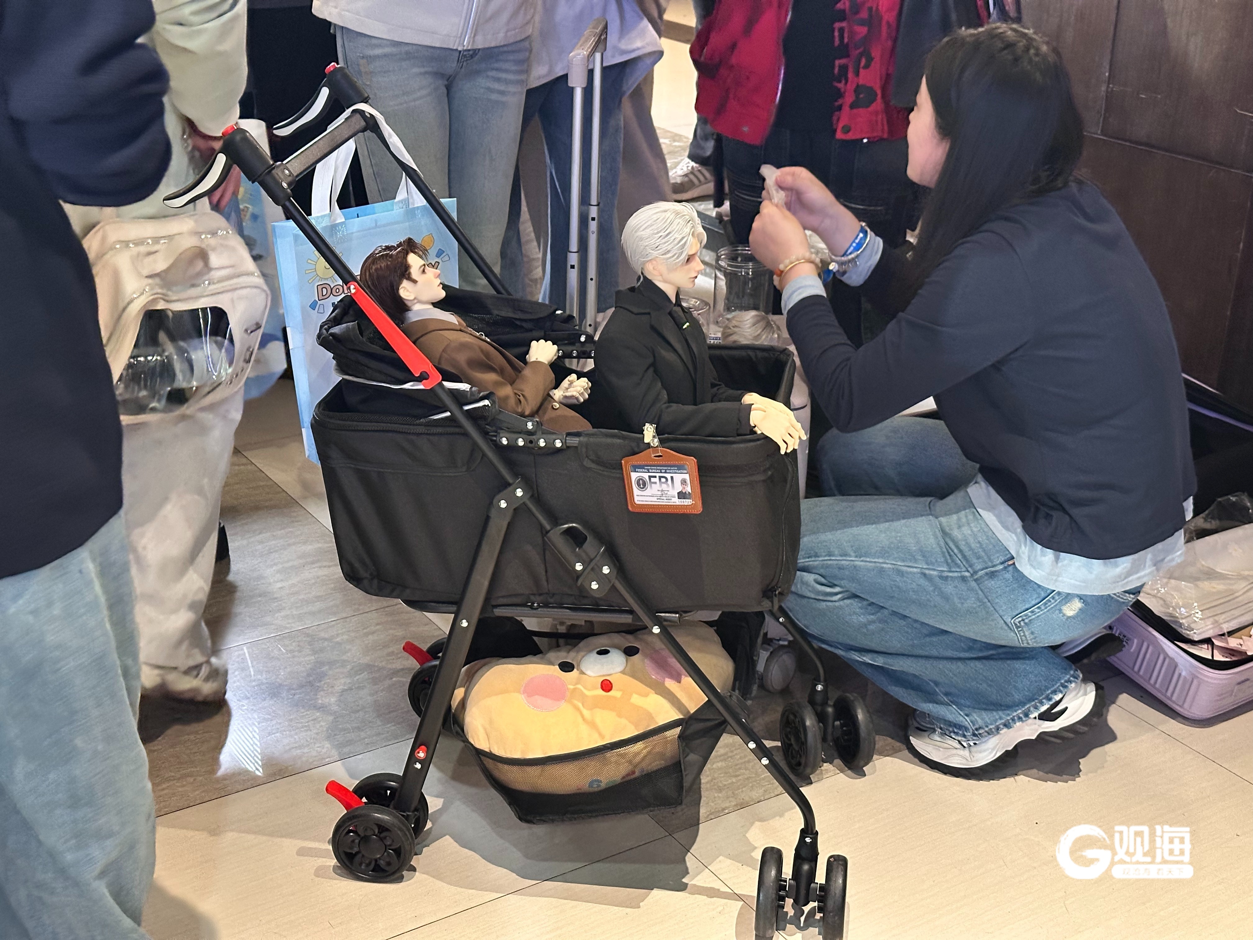 展會上不少“娃娘”推著迷你嬰兒車,車內坐著精心打扮的BJD。更多人則用抱真實嬰兒的姿勢——一手托頭、一手護背——將娃娃摟在懷里。來自市南區(qū)的“娃娘”小陳帶了四只娃娃參加活動,其中一只穿著她親手鉤織的毛衣?!拔移綍r一個人住,下班回家第一件事就是跟它們打個招呼,就像有家人等我一樣。”