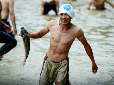 廣西辦徒手抓活魚大賽 男子泥塘赤身捉魚