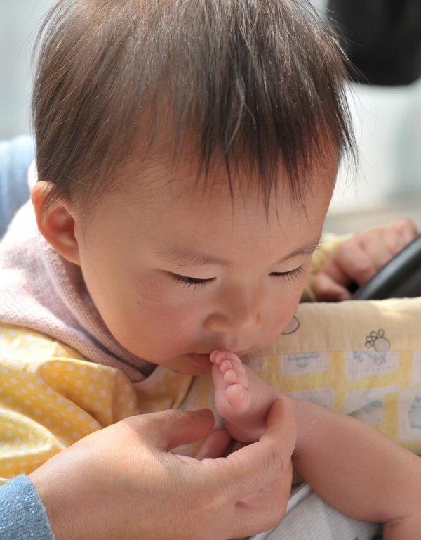 圖為姐姐在親吻妹妹的小腳丫。