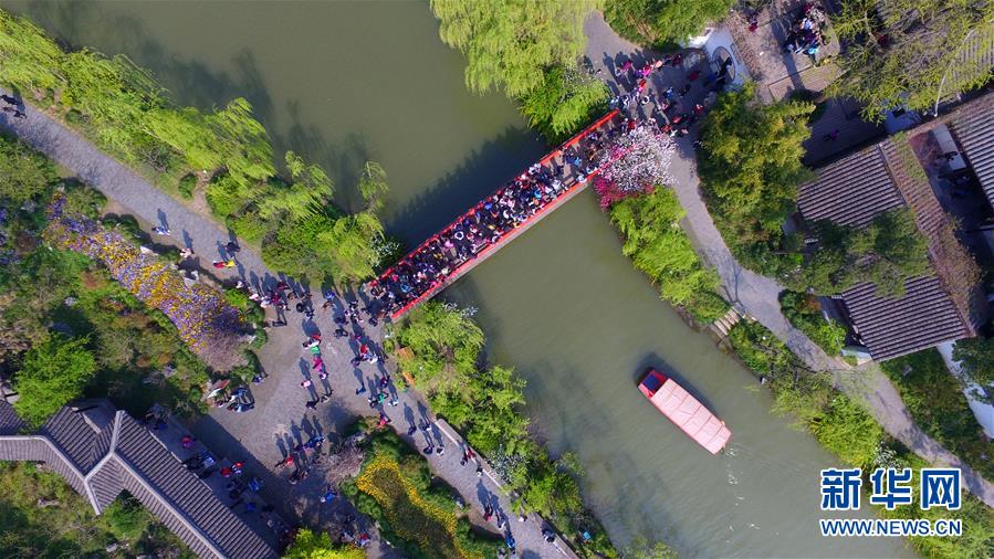 4月2日,游人在江蘇揚州瘦西湖景區(qū)游玩。