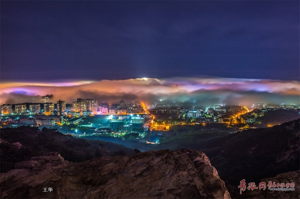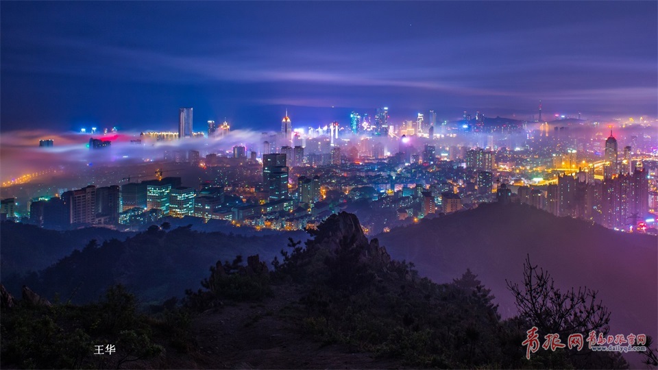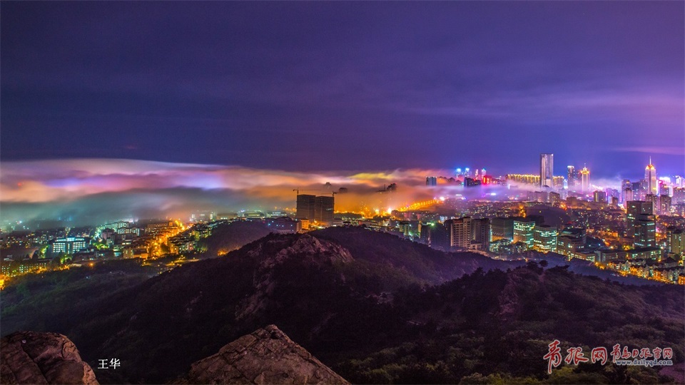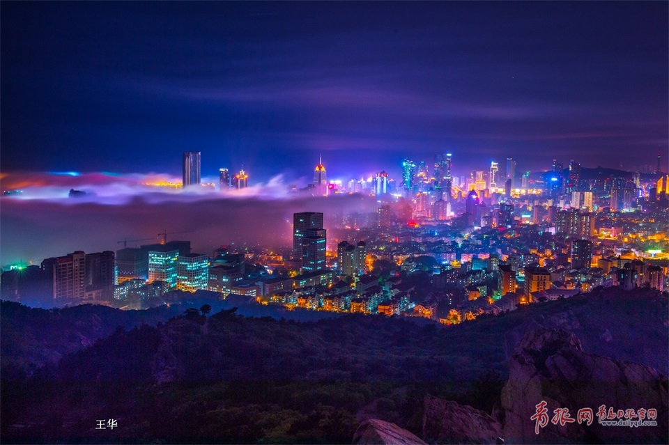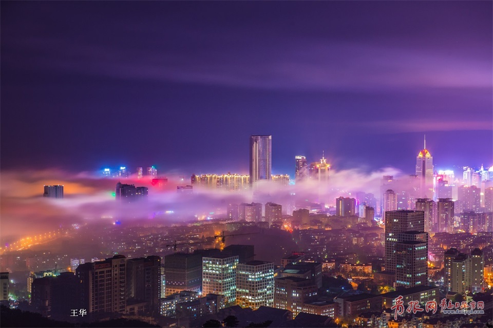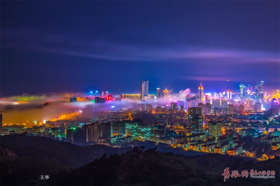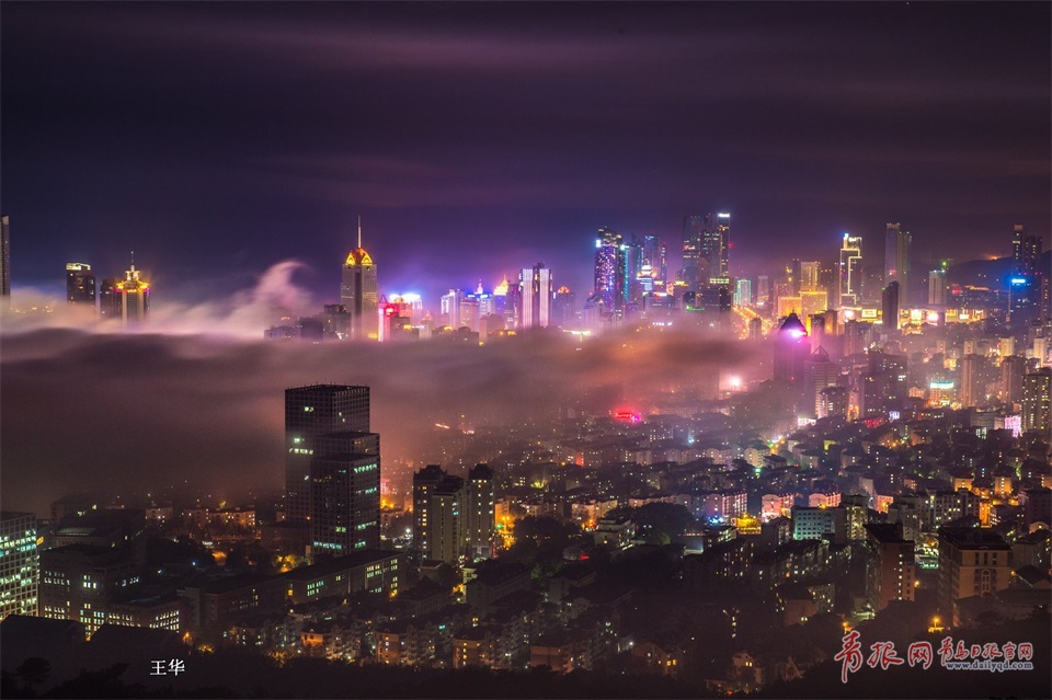 夜晚來(lái)臨,平流霧久久不散,五彩云霧飄浮在城市半空,仙氣彌漫的夜青島更顯神秘,仿若一座“云上的城市”。