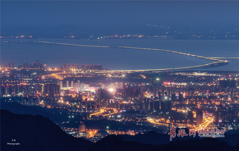 華燈初上的跨海大橋猶如一條巨龍,盤踞在膠州灣上。(2017年4月26日拍攝)