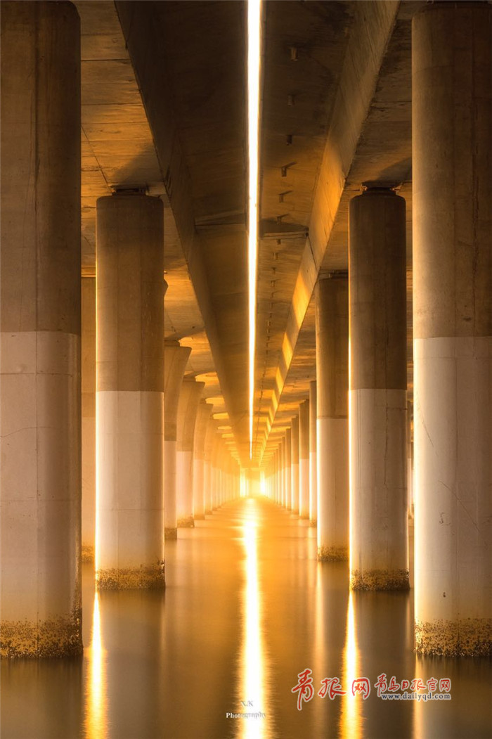 金光橫穿橋洞,粗壯的橋墩有序排列,宛如盜夢(mèng)空間。(2015年7月2日拍攝)