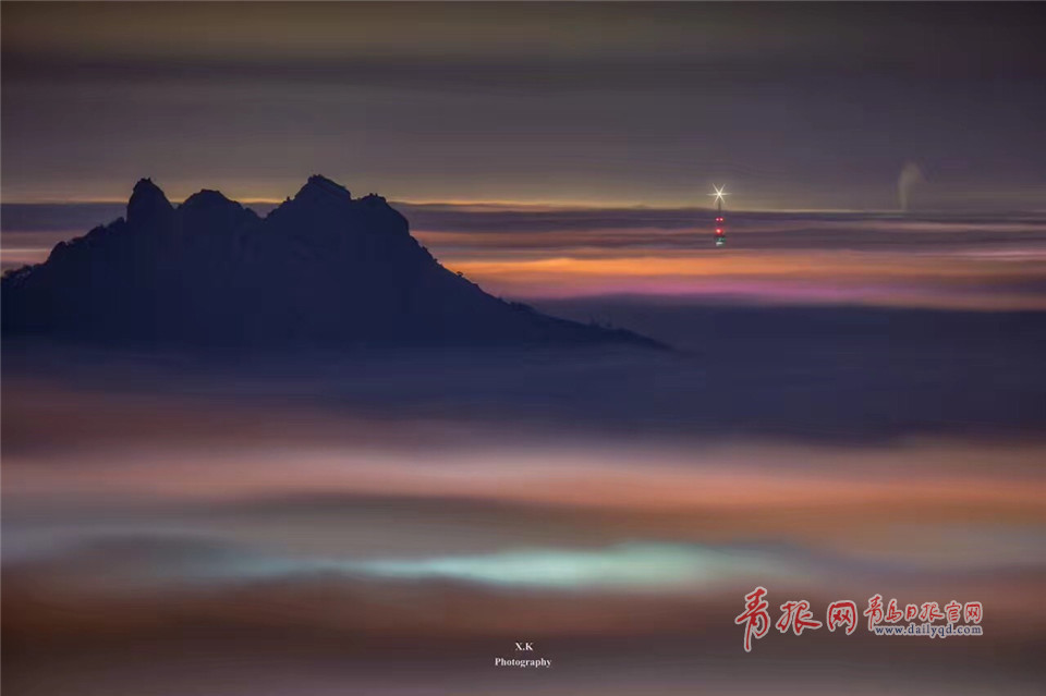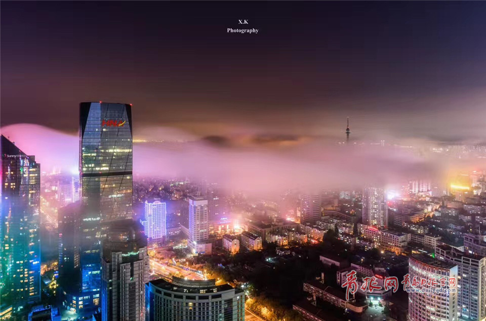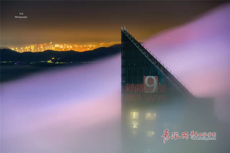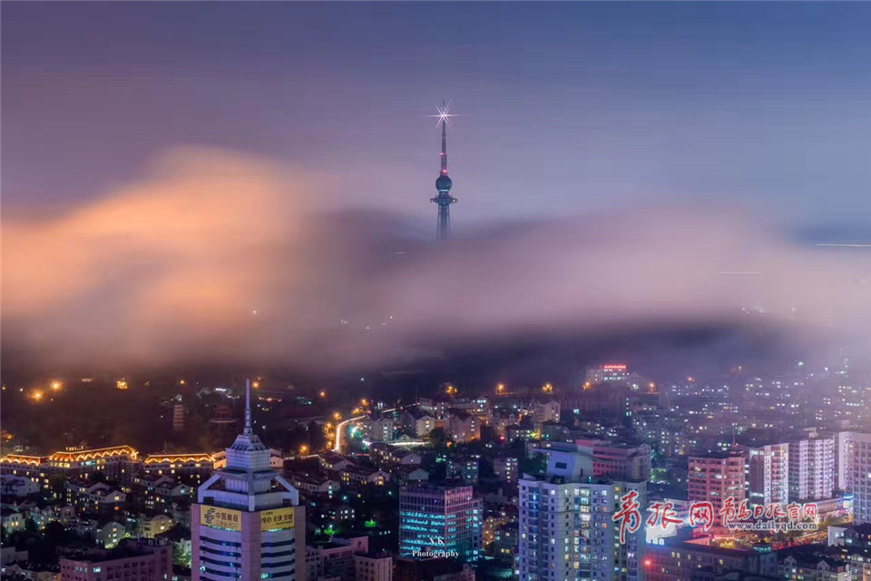 青島日報/青島觀/青報網(wǎng)訊 五月以后,青島進入海霧季,夜晚平流霧頻繁登臨青島,夜景大片上演。東部CBD附近的建筑在平流霧里時隱時現(xiàn),霧氣在夜間燈光的輝映下,流光溢彩。嶗山在霧氣中更是仙氣十足,宛若仙境。整座城市如同漂浮在云海之上,神秘而唯美。