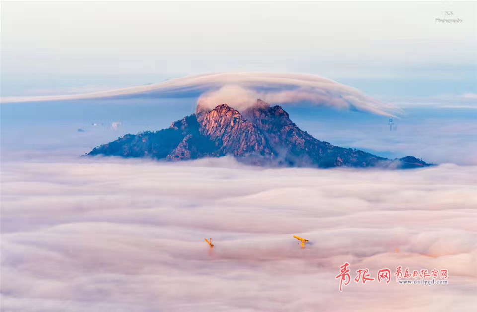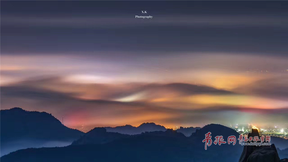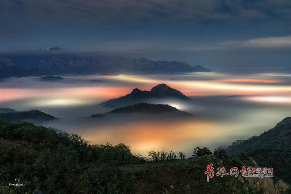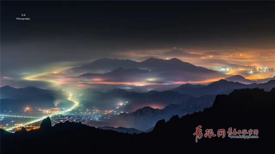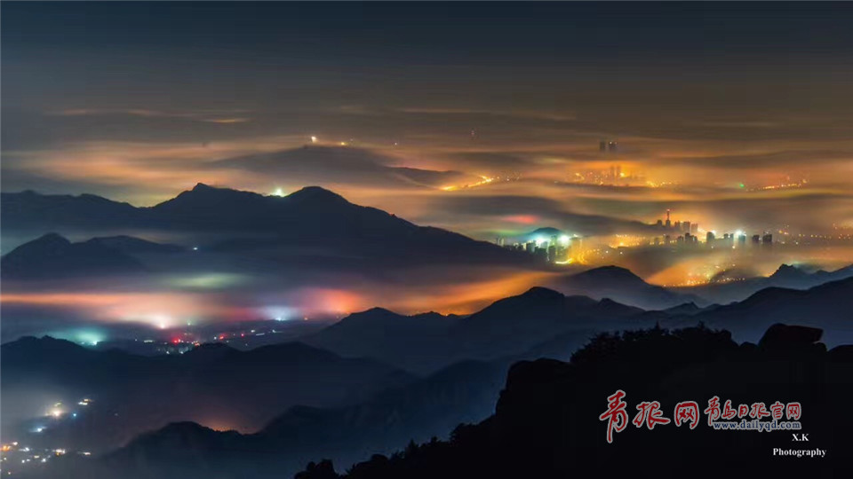 嶗山,七彩云霧纏繞群山,城市沉入深眠。