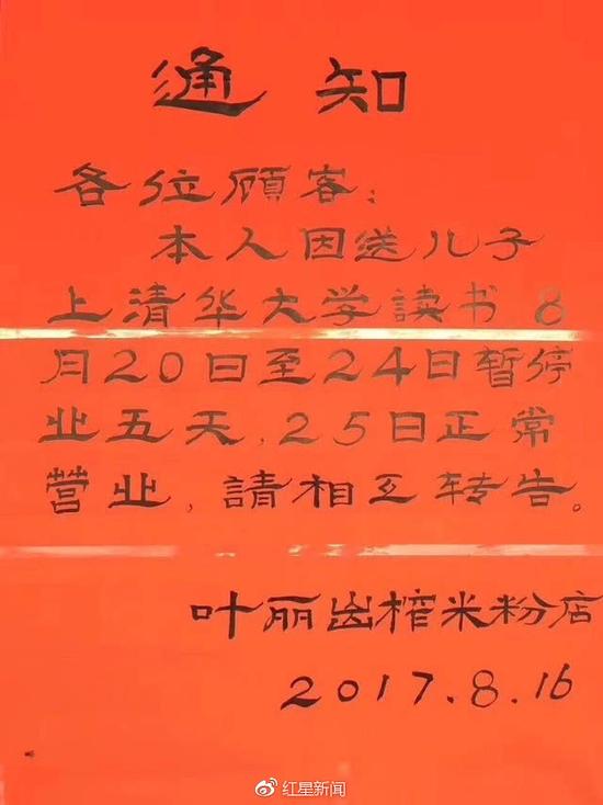 據(jù)了解,米粉店老板的兒子名叫唐超,今年考上了清華大學(xué)土木工程系。8月21日上午,記者聯(lián)系上該店老板,其一家三口正在逛故宮。他表示,歇業(yè)通知是自己寫的,23日將和孩子一起去學(xué)校報(bào)到。