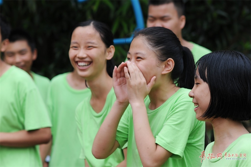 在青島市盲校內(nèi),參加軍訓(xùn)的盲生相互“拉歌”。