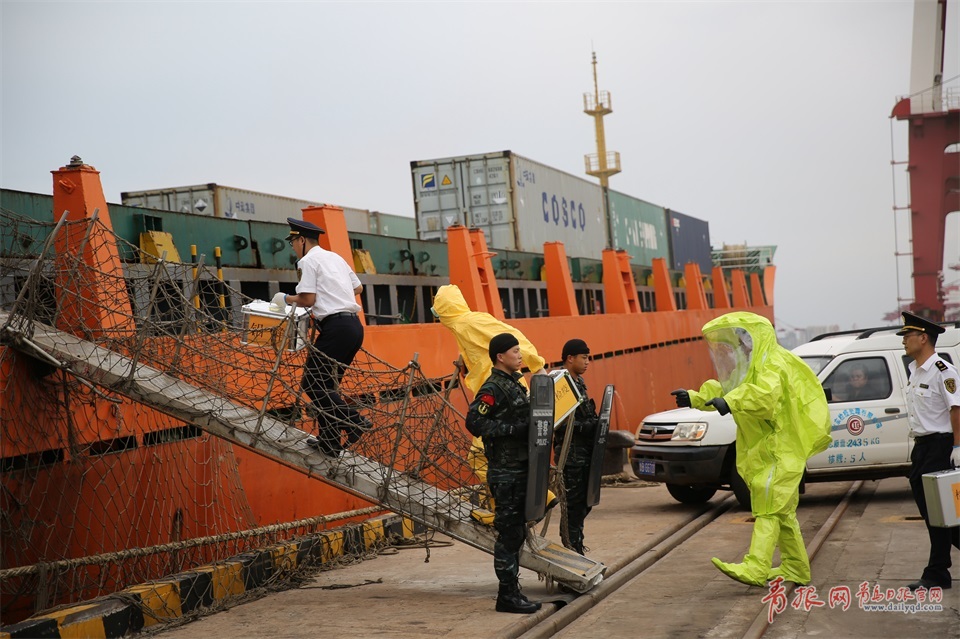 演練模擬黃島口岸同時(shí)遭受三處爆恐襲擊,口岸部門啟動(dòng)《處置恐怖襲擊事件工作預(yù)案》,各部門迅速出擊,抓獲暴恐分子,撲滅引燃的易燃物品,海關(guān)、海事巡邏艇在集裝箱船舶周邊海域鋪設(shè)防油污圍欄,并收繳走私暴恐物資。圖為8月29日,黃島出入境檢驗(yàn)檢疫局的工作人員對(duì)核生化有害物質(zhì)進(jìn)行檢測(cè)。