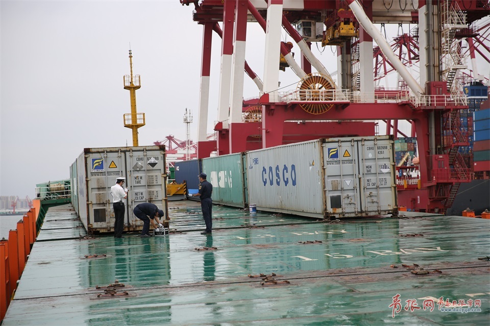 圖為8月29日,黃島海關(guān)關(guān)員核查貨輪所載危險(xiǎn)品集裝箱受損情況。