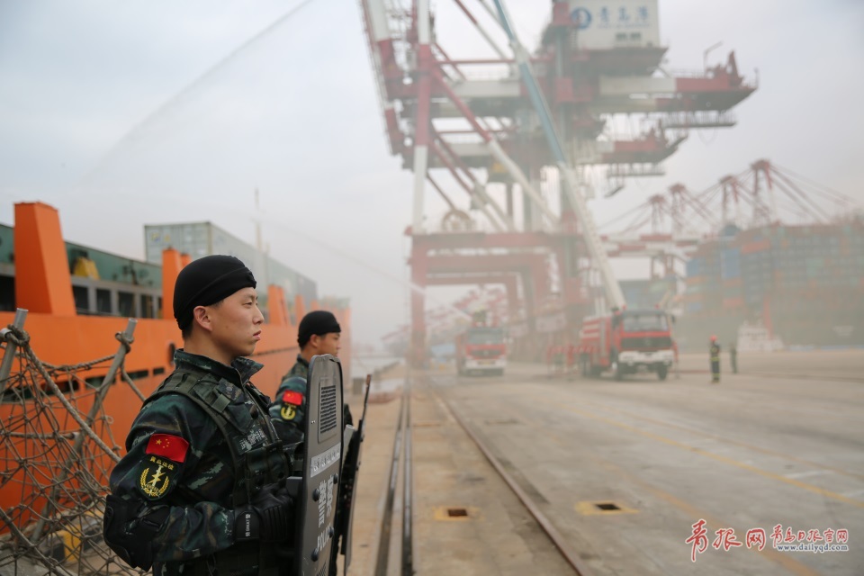 昨日(8月29日),黃島海關(guān)聯(lián)合黃島出入境檢驗(yàn)檢疫局、青島海事局、黃島邊防檢查站及青島港(集團(tuán))有限公司、青島港公安局,在青島港前灣港區(qū)、油港區(qū)及危險(xiǎn)品庫等共同舉辦“護(hù)航—2017”港口反恐演練。圖為8月29日,黃島邊防檢查站的防爆隊(duì)員在被“劫持”的貨輪上擒拿暴恐分子。