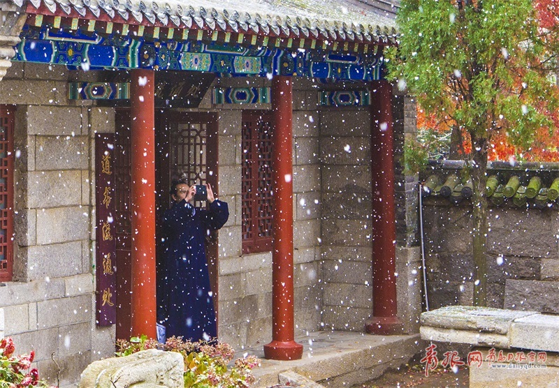 太清宮是嶗山道教祖庭,從初創(chuàng)到現(xiàn)在已經(jīng)經(jīng)歷了兩千多年的歷史,幾乎每朝每代都進(jìn)行過修茸,其建筑風(fēng)格至今依然保持著宋代建筑的典型特征。圖為嶗山道士用手機(jī)拍攝雪景。