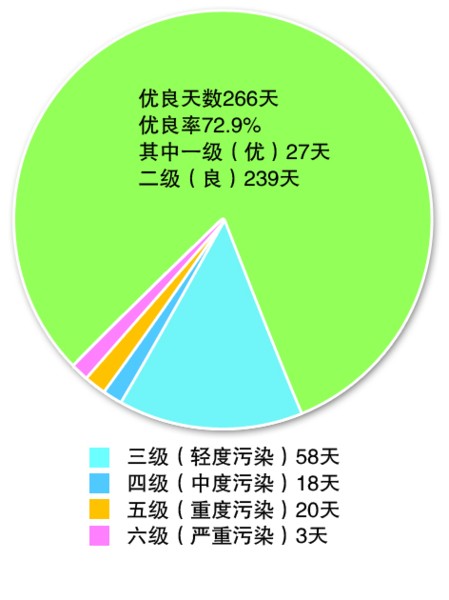 ??? 昨天,青島市環(huán)保局發(fā)布我市去年空氣質(zhì)量狀況。監(jiān)測(cè)顯示,去年我市市區(qū)環(huán)境空氣質(zhì)量?jī)?yōu)良天數(shù)266天,優(yōu)良率72.9%。研究結(jié)果顯示,我市空氣中PM2.5約40%來源于各類燃煤,22%來源于城市揚(yáng)塵,20%來源于機(jī)動(dòng)車排放。
