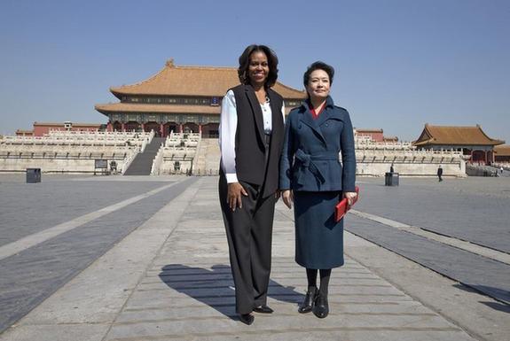 ????3月21日,美國總統(tǒng)夫人米歇爾·奧巴馬在彭麗媛的陪同下游覽故宮。米歇爾的76歲母親羅賓遜夫人和正休春假的兩個(gè)女兒瑪利亞、薩莎也一同前往。
