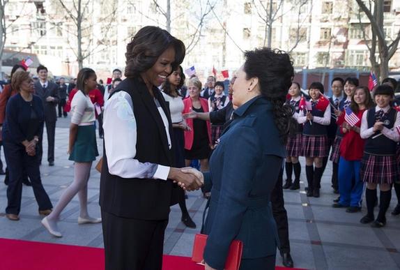 今天上午,彭麗媛陪同米歇爾·奧巴馬一行參觀北師大二附中。