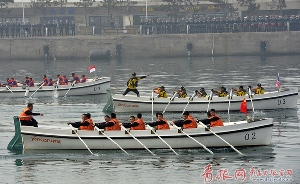 中外海軍官兵在奧帆中心參加舢板比賽。記者 李學(xué)亮 攝