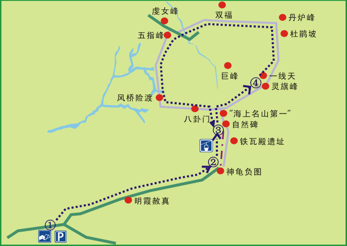 如上圖虛線所指示,大河?xùn)|停車場——巨峰車行路——巨峰索道——巨峰環(huán)行線, 全程來回5小時左右。