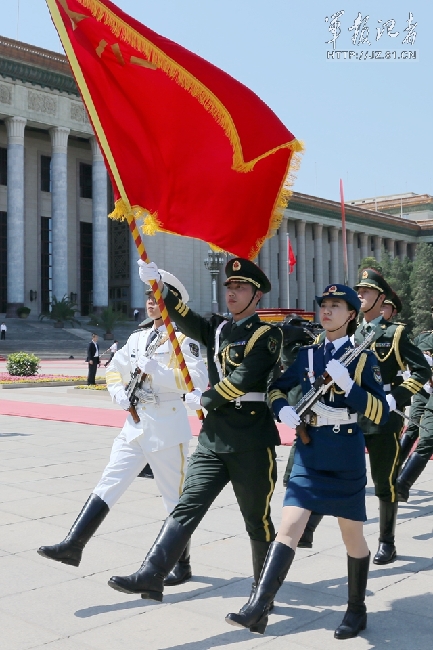 ????中國軍網(wǎng)北京5月12日電(解放軍報記者鄒維榮)“總統(tǒng)閣下,中國人民解放軍三軍儀仗隊列隊完畢,請您檢閱!”今天下午15點30點,土庫曼總統(tǒng)庫爾班古力·別爾德穆哈梅多夫來訪,在人民大會堂東門外廣場歡迎儀式上,在雄壯的國歌聲中151名最大陣容的解放軍陸??杖妰x仗隊伍中颯爽英姿的13名女兵正式亮相,接受了黨和國家領(lǐng)導(dǎo)人的檢閱,成為我軍歷史上的首批儀仗女兵。