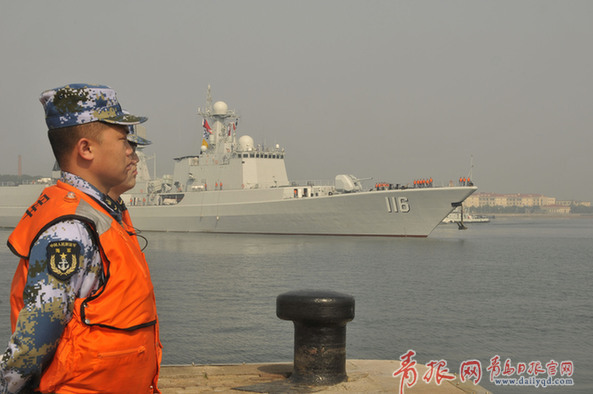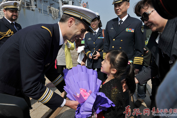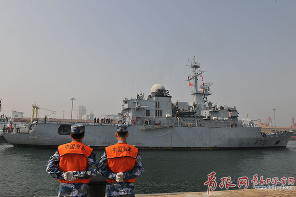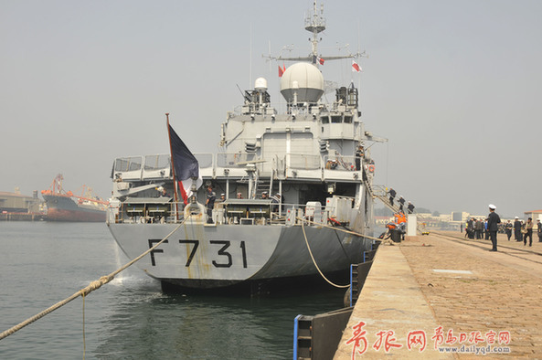 ????青島日報(bào)/青報(bào)網(wǎng)訊 2014年正值中法兩國正式建交50周年,22日上午,隸屬于法國太平洋艦隊(duì)的“牧月”號護(hù)衛(wèi)艦(舷號F731),在艦長弗雷德里克?多馬中校的率領(lǐng)下,緩緩駛抵青島某軍港碼頭,開始對青島進(jìn)行為期5天的友好訪問。北海艦隊(duì)在碼頭舉行儀式,歡迎“牧月”號第二次訪問青島。