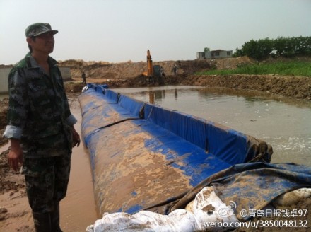 膠州云溪河防洪閘下游大沽河堤防段,云集了260人的防汛搶險(xiǎn)隊(duì)伍,30多臺(tái)各類搶險(xiǎn)車輛和設(shè)備。實(shí)戰(zhàn)演練場面頗為精彩,分為水下堵漏、反濾圍井、搶筑子堤、堤圍滑坡?lián)屪o(hù)以及發(fā)電機(jī)與照明燈具使用、帳篷搭設(shè)及凈水應(yīng)急處理5個(gè)科目?!斑@次演練培訓(xùn)檢驗(yàn)了我們的一些新式武器,”市防汛指揮部辦公室主任程善福介紹道。記者目睹了凈水處理車的現(xiàn)場演習(xí),只見這臺(tái)綠色車輛從河道里取水、凈化,不一會(huì)兒,河水已經(jīng)過處理系統(tǒng)變成了一杯杯馬上就能喝的飲用水,"這是為了在防汛緊急狀況中,為一線搶險(xiǎn)隊(duì)員和周邊群眾準(zhǔn)備好干凈衛(wèi)生的可飲用水?。⑺榻B道。一種新型搶險(xiǎn)救災(zāi)物資--浮力壩式擋水子堤隨后登臺(tái)亮相,河水漫溢時(shí),搶險(xiǎn)隊(duì)員們把一塊百米見方、帶有浮標(biāo)的基礎(chǔ)壩布在河床上迅速鋪開、固定,然后再拉起來,密封,迅速"兜"起了涌入的河水,打了一個(gè)臨時(shí)子堤!隨著水流不斷涌入,帶浮標(biāo)的水壩壩體鼓脹起來,把水漸漸"兜"滿......他介紹,洪水來得急時(shí),這種設(shè)備可以在堤前搶筑子堤,不使洪水漫溢。