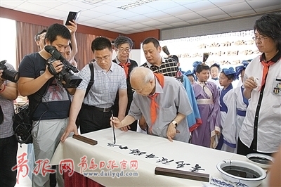 歐陽(yáng)中石說(shuō),曾經(jīng)有人妄言:漢字不會(huì)長(zhǎng)久。他對(duì)此很不以為然。事實(shí)證明,一百多年過(guò)去了,說(shuō)這話的人已不在了,但我們的漢字卻越來(lái)越旺盛。他認(rèn)為,書(shū)法,以我們的漢字為主,人們都來(lái)寫(xiě)書(shū)法、學(xué)漢字,就是弘揚(yáng)我們中華的文化,而從小學(xué)開(kāi)始研習(xí)書(shū)法,弘揚(yáng)中華文化,是件很了不起的事。在這方面,青島走在了全國(guó)前列,令他十分欣慰。