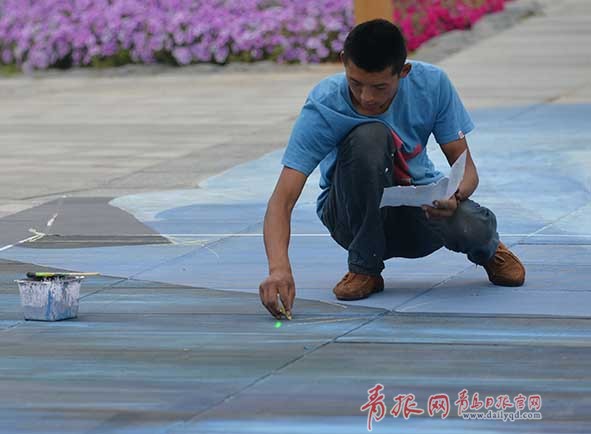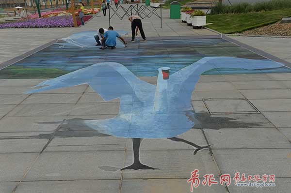 2014青島世界園藝博覽會(huì)在主題館廣場(chǎng)和地池東側(cè)步行道布置兩幅3D繪畫作品。來自青島理工大學(xué)藝術(shù)系、專門從事3D繪畫的聶圣全,帶領(lǐng)許新、杜佳昌兩位大三學(xué)生正在專心致志繪制作品。