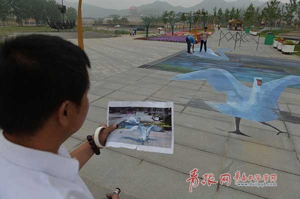 在地池東側(cè)步行道,聶圣全他們正在繪制兩只寧?kù)o平和的白天鵝在水池邊嬉戲水翅的3D畫作。聶圣全站在畫作前5米處一固定的位置,左手持效果圖,右手用激光筆在地面打點(diǎn),另一個(gè)人按照激光筆的指示,在地面做標(biāo)記,然后用膠帶把點(diǎn)連接起來,畫作構(gòu)架基本完成了。剩下的工作就是按效果圖著色,細(xì)化修改。這幅3D作品將成為世園會(huì)新的看點(diǎn)。