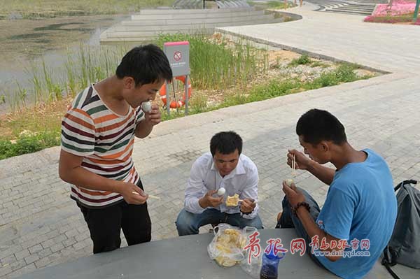 頭頂烈日繪制一上午,中午時(shí)分,聶圣全三人在湖邊樹蔭下,簡(jiǎn)單吃點(diǎn)買來的咸鴨蛋和油餅。