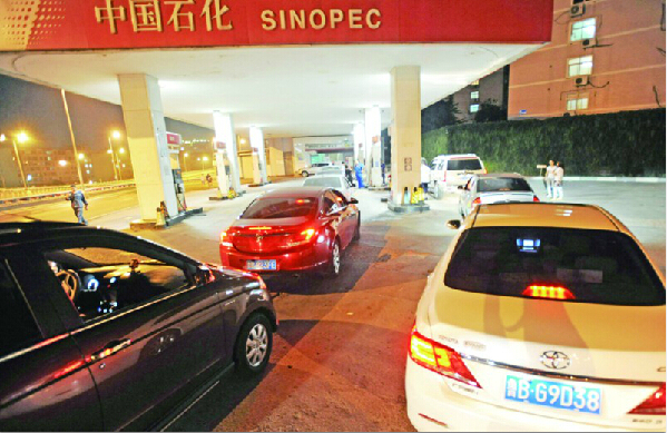 ??????????????????????? 23日晚,不少汽車在四川路一家加油站排隊(duì)加油。