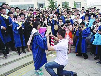 參加完畢業(yè)典禮后,劉琳婧被室友們“押送”到了現(xiàn)場(chǎng),當(dāng)男友單膝跪地,舉著鉆戒說出求婚誓詞的時(shí)候,周圍剛剛參加完畢業(yè)典禮的3000多名碩士和博士一下子都成了親友團(tuán),紛紛歡呼、尖叫著,讓女生答應(yīng),其他的學(xué)弟學(xué)妹們也很興奮,反復(fù)地催促著學(xué)姐快快答應(yīng)。