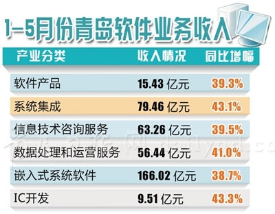 青島日?qǐng)?bào)/青報(bào)網(wǎng)訊 記者從青島市經(jīng)信委了解到,今年前5個(gè)月,全市軟件業(yè)務(wù)收入穩(wěn)定增長(zhǎng),累計(jì)完成軟件業(yè)務(wù)收入390多億元,同比增長(zhǎng)40%。