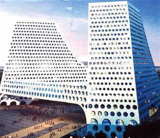 記者看到,藍(lán)色中心的外觀比較特別,樓體建筑呈直角梯形結(jié)構(gòu),其中斜邊所在的“腰”為“弧形”,就像是滑板極限運(yùn)動的“賽道”,但這條“賽道”不是平坦光滑的,而是根據(jù)樓層出現(xiàn)一個個的“階梯”。效果圖顯示,這些階梯將變成一個個的花園,讓綠色從一樓一直攀爬至24樓。此外,效果圖還顯示,樓體穿了一件布滿圓形空洞的“外衣”,也是藍(lán)色中心方案設(shè)計的最大亮點,叫作“立體外遮陽系統(tǒng)”。該遮陽系統(tǒng)由帶孔的鋁板組成,大孔布置在窗洞位置,小孔布置在大孔周圍,距離墻面60厘米,利用夏冬太陽光線照射的不同角度,從而起到冬暖夏涼的作用。